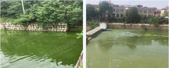 治理前水體發(fā)綠,水體富營(yíng)養(yǎng)化嚴(yán)重。wtU新型光催化網(wǎng)_水庫(kù)治理_河道治理_水生態(tài)修復(fù)_水環(huán)境治理與修復(fù)_江蘇雙良環(huán)境科技有限公司