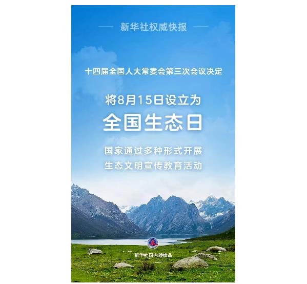 6月28日,十四屆全國(guó)人大常委會(huì)第三次會(huì)議決定:將8月15日設(shè)立為全國(guó)生態(tài)日。國(guó)家通過多種形式開展生態(tài)文明宣傳教育活動(dòng)。習(xí)近平同志在浙江工作期間,2005年8月15日考察湖州市安吉縣,首次提出“綠水青山就是金山銀山”科學(xué)論斷。這一論斷是習(xí)近平生態(tài)文明思想的核心理念。將8月15日設(shè)立為全國(guó)生態(tài)日,比較符合確定紀(jì)念日、活動(dòng)日時(shí)間的基本原則,能夠充分體現(xiàn)首創(chuàng)性、標(biāo)志性、獨(dú)特性。設(shè)立全國(guó)生態(tài)日,有利于更好學(xué)習(xí)宣傳貫徹習(xí)近平生態(tài)文明思想,提高全社會(huì)生態(tài)文明意識(shí),增強(qiáng)全民生態(tài)環(huán)境保護(hù)的思想自覺和行動(dòng)自覺,以釘釘子精神推動(dòng)生態(tài)文明建設(shè)不斷取得新成效。