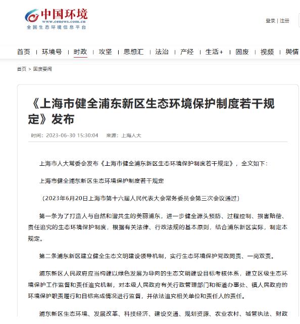 《上海市健全浦東新區(qū)生態(tài)環(huán)境保護制度若干規(guī)定》于2023年6月20日經(jīng)市十六屆人大常委會第三次會議表決通過,將于2023年8月15日起施行。