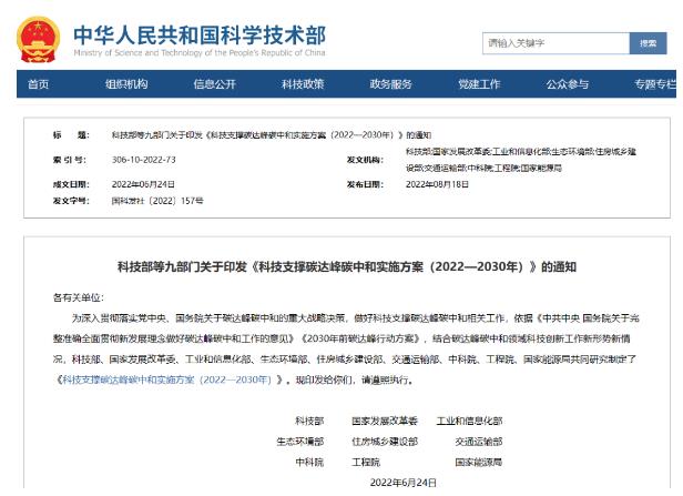 為深入貫徹落實黨中央國務(wù)院關(guān)于碳達(dá)峰碳中和的重大決策部署,按照碳達(dá)峰碳中和“1+N”政策體系的總體安排,科技部會同發(fā)展改革委、工業(yè)和信息化部、生態(tài)環(huán)境部、住房和城鄉(xiāng)建設(shè)部、交通運輸部等九部門組織編制了《科技支撐碳達(dá)峰碳中和實施方案(2022—2030年)》,《實施方案》統(tǒng)籌提出支撐2030年前實現(xiàn)碳達(dá)峰目標(biāo)的科技創(chuàng)新行動和保障舉措,并為2060年前實現(xiàn)碳中和目標(biāo)做好技術(shù)研發(fā)儲備,為全國科技界以及相關(guān)行業(yè)、領(lǐng)域、地方和企業(yè)開展碳達(dá)峰碳中和科技創(chuàng)新工作的開展起到指導(dǎo)作用。