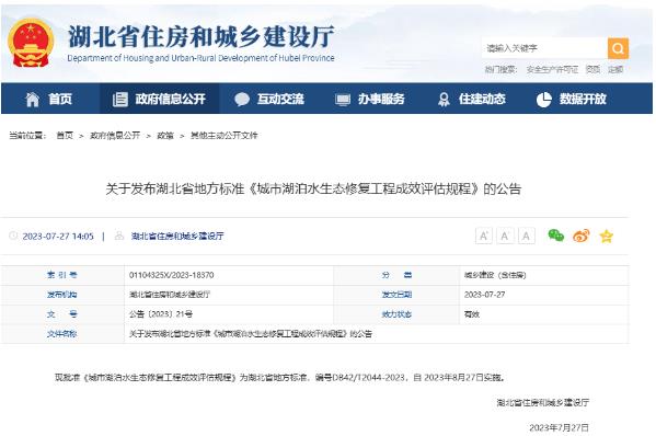 現(xiàn)批準(zhǔn)《城市湖泊水生態(tài)修復(fù)工程成效評估規(guī)程》為湖北省地方標(biāo)準(zhǔn),編號DB42/T2044-2023,自 2023年8月27日實施。