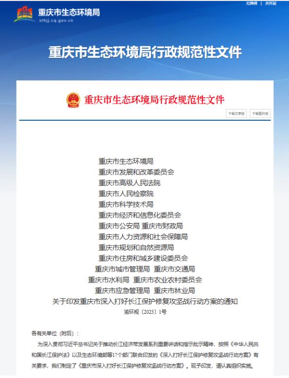 重慶市生態(tài)環(huán)境局聯(lián)合重慶市發(fā)展和改革委員會等共17部門共同發(fā)布《重慶市深入打好長江保護修復(fù)攻堅戰(zhàn)行動方案》,通過持續(xù)深化水環(huán)境綜合治理,大力推進水生態(tài)環(huán)境保護修復(fù),切實加強水資源保護,全力保障水環(huán)境安全,加快形成綠色發(fā)展管控格局等措施,深化綜合治理、系統(tǒng)治理、源頭治理,協(xié)同推進高質(zhì)量發(fā)展和生態(tài)環(huán)境高水平保護,筑牢長江上游重要生態(tài)屏障,推動山清水秀美麗之地建設(shè)取得重大進展。