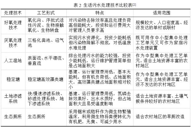 農(nóng)村生活污水末端治理工藝可分為生物處理技術(shù)和生態(tài)處理技術(shù)兩大類。生物處理技術(shù)主要包括好氧生物處理和厭氧生物處理兩大類;生態(tài)處理技術(shù)主要包括人工濕地、穩(wěn)定塘、土地滲濾系統(tǒng)。生態(tài)廁所是基于過程控制應(yīng)用的技術(shù),其對黑水的后續(xù)處理起關(guān)鍵作用。生活污水處理技術(shù)具體的特點(diǎn)和適用范圍見表2。