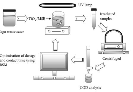 2/MSB混合物有較高的COD去除能力。此外,曝氣還使COD去除率進(jìn)一步提高了11%。模型的回歸值R2>0.99,表明評估參數(shù)之間存在高度的相關(guān)性。這些結(jié)果證明了TiO2光催化作為一種有吸引力的淀粉廠廢水處理替代方案的可行性,工業(yè)固體廢物可用于廢水降解。