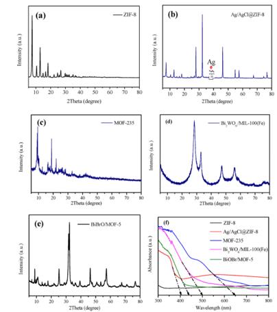 QZ2新型光催化網_水庫治理_河道治理_水生態(tài)修復_水環(huán)境治理與修復_江蘇雙良環(huán)境科技有限公司QZ2新型光催化網_水庫治理_河道治理_水生態(tài)修復_水環(huán)境治理與修復_江蘇雙良環(huán)境科技有限公司圖2.(a)ZIF-8,(b)Ag / AgCl @ ZIF-8,(c)MOF-235,(d)Bi2WO6/MIL-100(Fe),(e)BiOBr/MOF-5的XRD圖,和(f)光催化劑的UVevis圖。