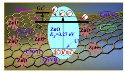 2吸附-脫附分析,對ZnO/石墨烯的結構和組成進行了表征。Zn-O-C鍵的形成證明了材料合成成功。石墨烯的加入使ZnO半導體的帶隙略有縮小,在可見光范圍內光吸收性能顯著增強。在可見光下,氧化鋅的光還原活性很好。NG作為電子載體促進了光生載流子的分離,從而提高了ZnO/石墨烯的光活性。在紫外光照射下,帶隙激發(fā)的ZnO和激發(fā)態(tài)的石墨烯共同參與了Cr(VI)的光還原,而在可見光下,激發(fā)態(tài)石墨烯注入到ZnO的CB中的電子是其光活性的來源。光腐蝕抑制也得到了證實。本工作為以天然氣為原料制備氧化鋅/石墨烯納米雜化材料提供了一種簡單實用的方法。納米雜化物在水污染修復中表現(xiàn)出高效、穩(wěn)定的光催化性能。