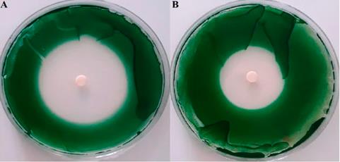 QZ2新型光催化網_水庫治理_河道治理_水生態(tài)修復_水環(huán)境治理與修復_江蘇雙良環(huán)境科技有限公司圖1 活性被測海藻精油在固體培養(yǎng)基上對銅綠假單胞菌的抗藍藻活性。(A) 歐囊鏈藻;(B)鈍馬尾藻