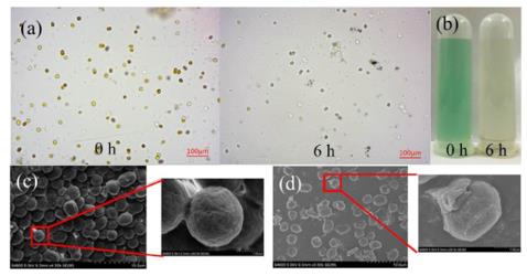 QZ2新型光催化網_水庫治理_河道治理_水生態(tài)修復_水環(huán)境治理與修復_江蘇雙良環(huán)境科技有限公司圖4. Ag / AgCl @ ZIF-8對銅綠微囊藻形態(tài)的影響:(a)放大倍數(shù)為40×的顯微鏡圖像,(b)藻類溶液的照片以及未處理(c)和處理過的(d)藻類細胞的SEM圖像