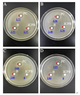 r1K新型光催化網(wǎng)_水庫(kù)治理_河道治理_水生態(tài)修復(fù)_水環(huán)境治理與修復(fù)_江蘇雙良環(huán)境科技有限公司圖2 20mg/LTCH在0h(A)、1h(B)、4h(C)和8h(D),采用PC(可見光光催化)、B(生物降解)和ICPB(光催化-生物降解耦合)對(duì)金黃色葡萄球菌的抑制作用。B組為附著生物膜的載體在黑暗環(huán)境下單獨(dú)進(jìn)行生物降解;PC組為可見光光催化(無生物膜培養(yǎng));ICPB組為可見光光催化與生物降解耦合。數(shù)字表示抑制區(qū)的半徑減去濾紙的半徑。