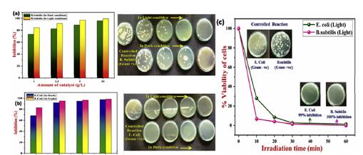 r1K新型光催化網(wǎng)_水庫(kù)治理_河道治理_水生態(tài)修復(fù)_水環(huán)境治理與修復(fù)_江蘇雙良環(huán)境科技有限公司圖1 不同光催化劑劑量對(duì)革蘭氏陽性菌—枯草芽孢桿菌(B. Subtilis)(a)和革蘭氏陰性菌—大腸桿菌(E. coli)(b)活性的抑制作用;光照催化時(shí)間對(duì)細(xì)胞活性的影響(c)。