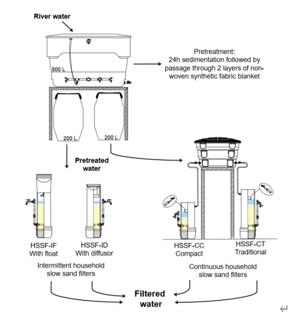 W5A新型光催化網(wǎng)_水庫治理_河道治理_水生態(tài)修復(fù)_水環(huán)境治理與修復(fù)_江蘇雙良環(huán)境科技有限公司本研究旨在評估四種家用慢砂過濾器(HSSF)模型在其整個生物層發(fā)育過程中去除河水中微生物的效率。兩種模型設(shè)計為連續(xù)運行(HSSF-CC和HSSF-CT),兩種模型設(shè)計為間歇運行(HSSF-ID和HSSF-IF)。每天給過濾器注入48 L預(yù)處理過的河水(24小時沉淀,然后通過無紡布合成毯過濾)。水樣通過大腸菌群細菌進行定量,用明亮視野顯微鏡觀察微生物。大腸菌群總減少量在1.42±0.59 log和2.96±0.58 log之間,連續(xù)模型表現(xiàn)出更好的性能(p值< 0.004)。HSSF-IF、HSSF-CC和HSSF-CT的大腸桿菌減少量在1.49±0.58 log到2.09±0.66 log之間,HSSF-IF、HSSF-CC和HSSF-CT表現(xiàn)相似(p值> 0.06),略優(yōu)于HSSF-ID (p值=0.04)。用顯微鏡在原水和預(yù)處理過的水中檢測藻類、原生動物和蠕蟲等微生物。藻類是這些樣本中最顯著的一組,盡管它們在過濾水中沒有被明亮視野顯微鏡觀察到。結(jié)果表明,HSSF具有降低河流水微生物風(fēng)險的潛力,從而增加了農(nóng)村社區(qū)使用地點水處理的范圍。但是,必須對HSSF生物層進行進一步的研究。
