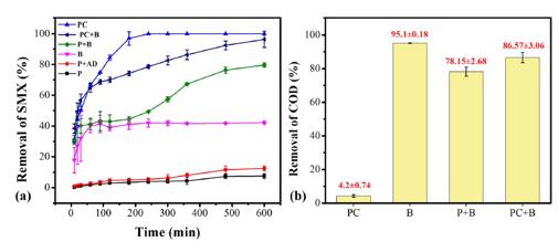 3JQ新型光催化網(wǎng)_水庫治理_河道治理_水生態(tài)修復_水環(huán)境治理與修復_江蘇雙良環(huán)境科技有限公司圖3 采用不同的處理方法(a)SMX和(b)COD的去除去除效果。P:僅LED光的光解;P+AD:LED的光解和原始載體的吸附,B:生物載體的生物降解,P+B:LED燈的光解和生物降解;PC:僅光催化,PC+B:光催化和生物降解。數(shù)值表示為平均值±標準偏差(SD)。