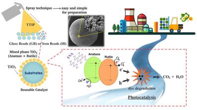 2 固定在兩種不同的基材上,包括玻璃和鐵珠。通過將液體分散液噴涂到基材上制備復(fù)合材料,然后將材料在不同溫度(600-750°C)下煅燒。在 700°C 的煅燒溫度下,SEM 和 EDS 分析表明,TiO