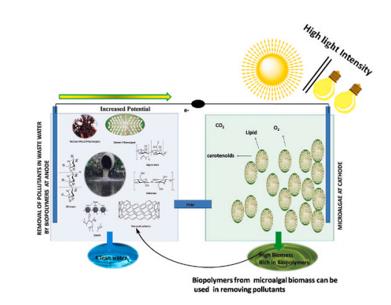 fTW新型光催化網(wǎng)_水庫治理_河道治理_水生態(tài)修復(fù)_水環(huán)境治理與修復(fù)_江蘇雙良環(huán)境科技有限公司圖3:圖文摘要fTW新型光催化網(wǎng)_水庫治理_河道治理_水生態(tài)修復(fù)_水環(huán)境治理與修復(fù)_江蘇雙良環(huán)境科技有限公司含有微藻的光合微生物燃料電池(PMFCs)在處理廢水方面具有巨大潛力,同時(shí)它能將光能轉(zhuǎn)化為電能。這種電池的效率直接取決于光照強(qiáng)度對(duì)藻類的生長。光照強(qiáng)度越強(qiáng),其產(chǎn)生富含生物聚合物的生物質(zhì)潛力越大。這種生物聚合物是由在陽極的細(xì)菌和在陰極的藻類同時(shí)作用產(chǎn)生,反之亦然。從生物資源中獲得的生物聚合物能夠單獨(dú)添加或者與納米材料結(jié)合后添加在污水中作為納米吸附劑。這些納米吸附劑通過去除金屬和染料等污染物,進(jìn)一步提高 PMFC的效率。在這篇文章中首先闡述了不同的光照強(qiáng)度對(duì)微藻生長的影響、硅藻在PMFC中的重要性以及藻類對(duì)PMFCs效率的影響。其次論述了從不同的生物資源中回收的生物聚合物及其在去除金屬、染料中的作用,以及他們?cè)谘h(huán)生物經(jīng)濟(jì)中的影響。最后,敘述了該研究領(lǐng)域的瓶頸和未來前景。