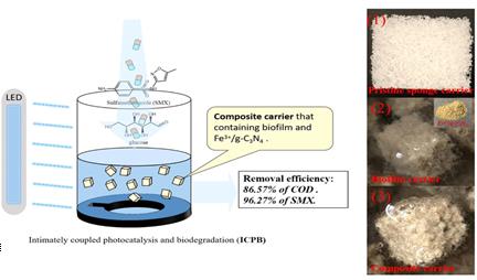 4 和生物膜緊密耦合的光催化和生物降解 (ICPB) 的系統(tǒng),用于處理含有 SMX 的綜合生活污水。結(jié)果顯示,ICPB系統(tǒng)能夠同時去除96.27 ± 5.27% 的 SMX和86.57 ± 3.06%的COD,這個系統(tǒng)比單獨(dú)利用光催化法(SMX 100%, COD 4.2 ± 0.74%) 和單獨(dú)利用生物降解法(SMX 42.21 ± 0.86%, COD 95.1 ± 0.18%)去除更有優(yōu)勢。ICPB系統(tǒng)中去除SMX的貢獻(xiàn)由大到小包括LED光催化、生物降解、LED光解和載體吸附作用,而去除COD主要由生物降解。SMX的初始濃度高會抑制 SMX去除率,而增加光催化劑用量會加快 SMX去除率,兩者對COD去除率均無影響。我們對生物膜活性的分析表明,該ICPB系統(tǒng)中的微生物保持了較高的存活率和代謝活性,生物膜的微生物群落結(jié)構(gòu)保持穩(wěn)定,其中